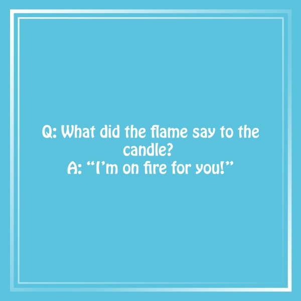 Q: What did the flame say to the candle? A: “I’m on fire for you!”