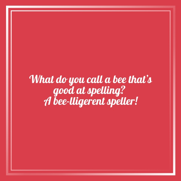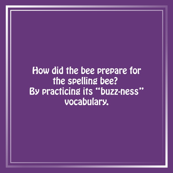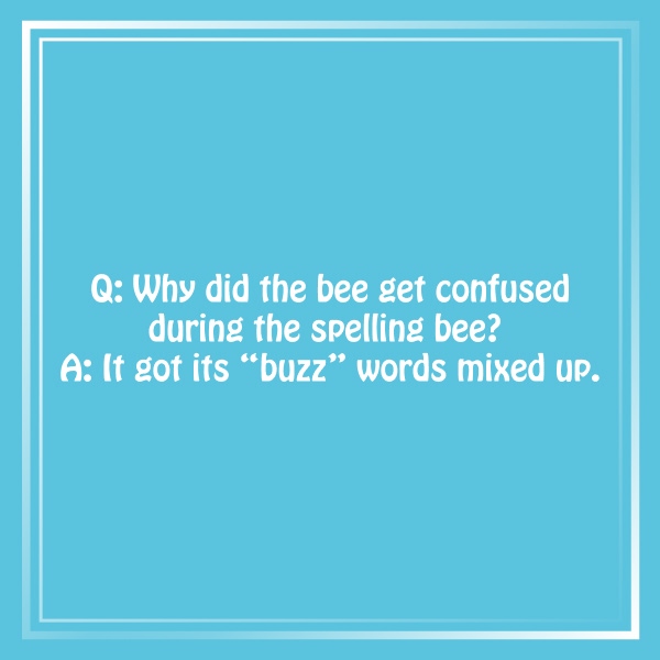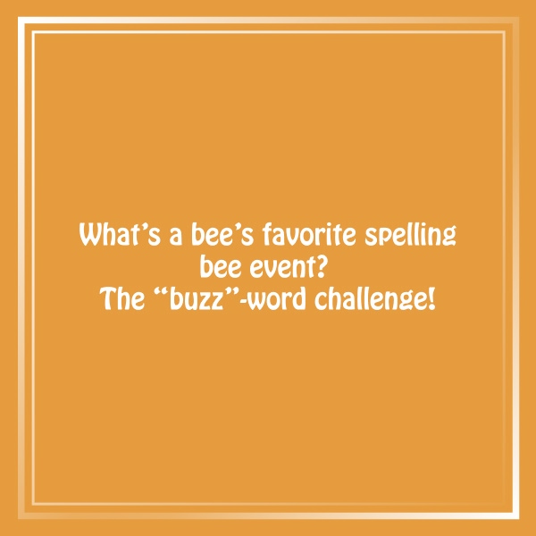 “A bee’s favorite word? ‘Buzz’ – because it’s always the bee’s knees in a spelling bee!”