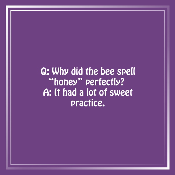 Q: Why did the bee spell “honey” perfectly? A: It had a lot of sweet practice.