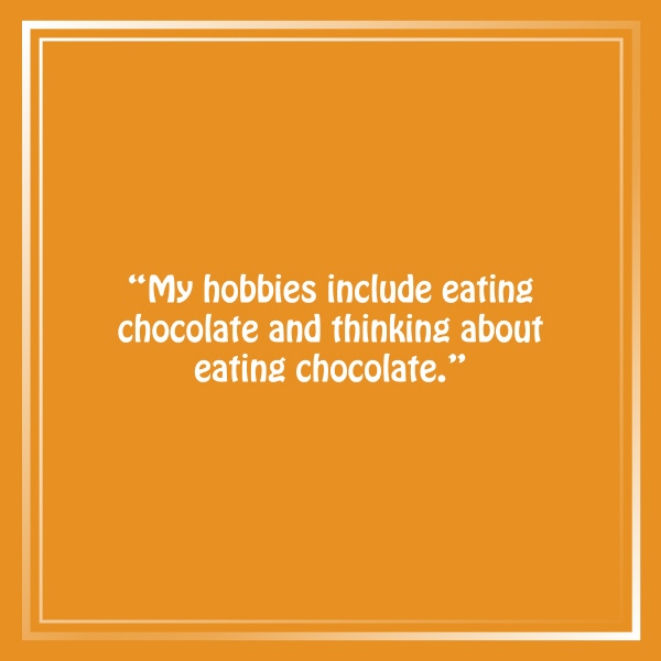 “My hobbies include eating chocolate and thinking about eating chocolate.”
