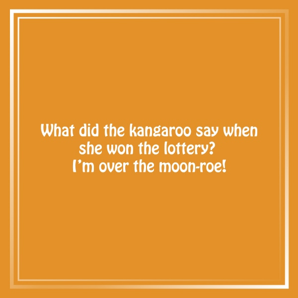 - What did the kangaroo say when she won the lottery? I’m over the moon-roe!