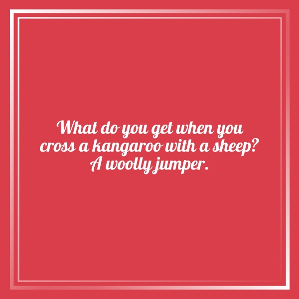 - What do you get when you cross a kangaroo with a sheep? A woolly jumper.